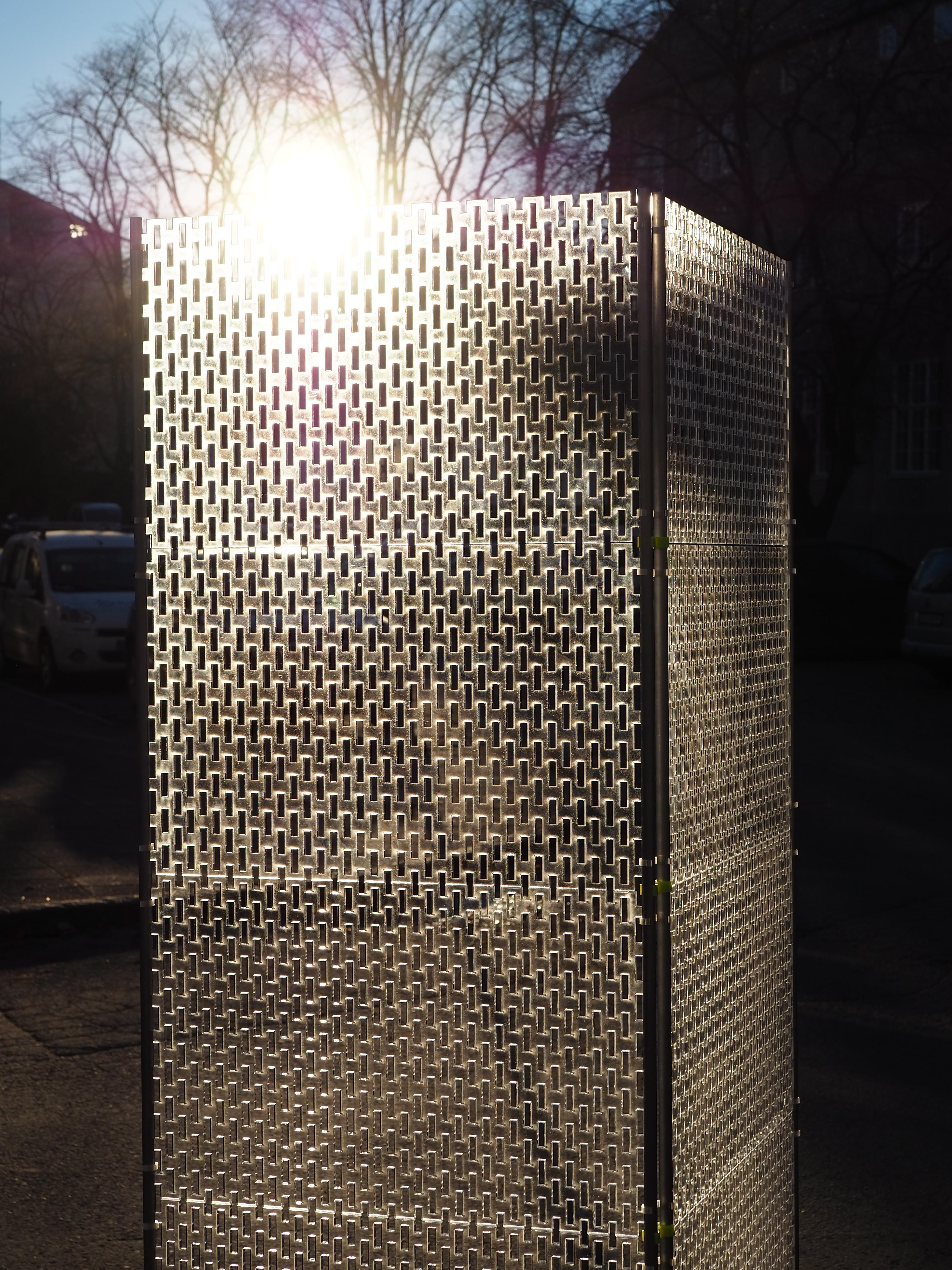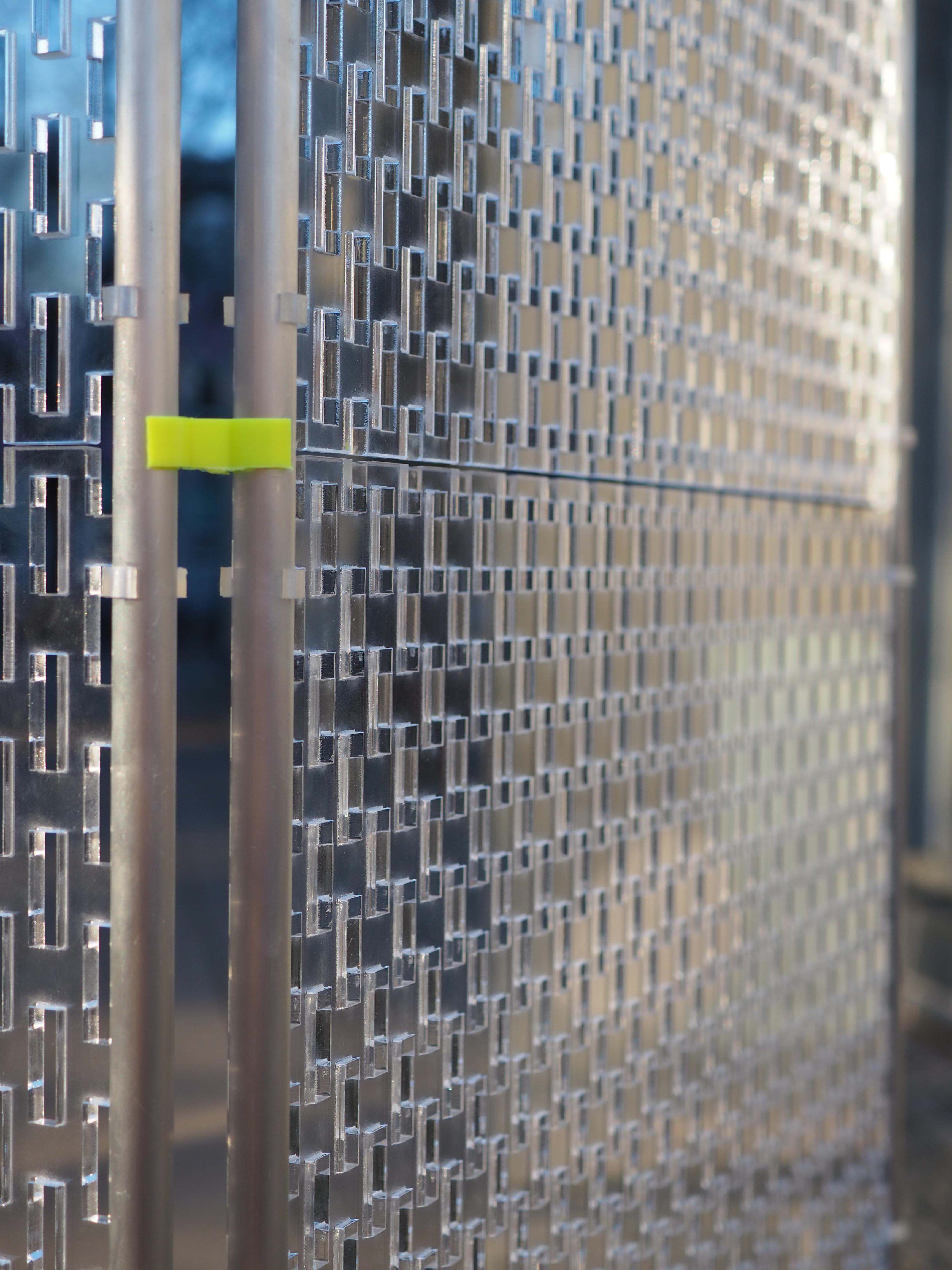 The acrylic glass needed to be divided into smaller parts to prevent it from bending during laser-cutting. The parts are framed by aluminium pipes, mounted in CNC-cut slots and fastened with 3D-printed clips.
